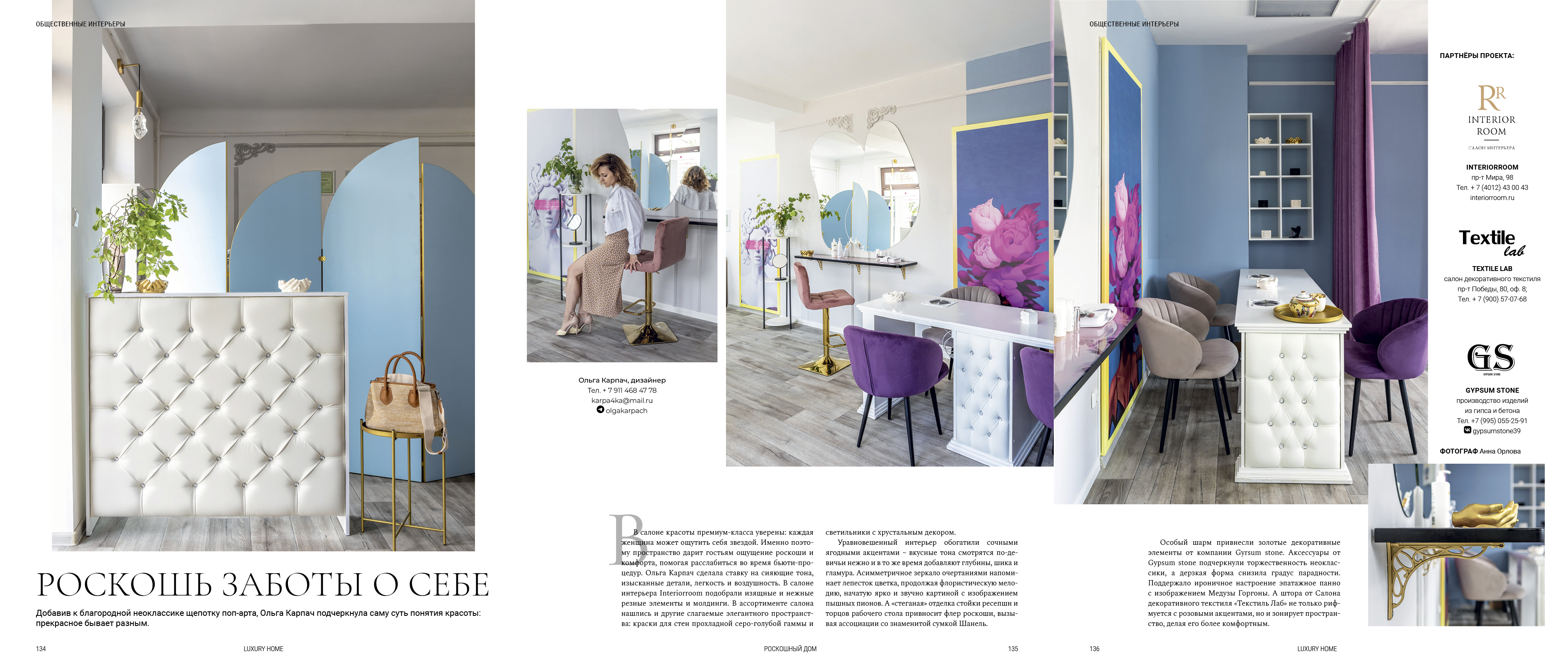 Интерьер салона красоты выполнен в стиле неоклассики с тонким шёпотом поп-арта — дерзкое и элегантное сочетание, создающее атмосферу гламура и уверенной эстетики. Классические формы и пропорции здесь переосмыслены через цвет: насыщенные, выразительные оттенки становятся главным инструментом роскоши и визуального эффекта.